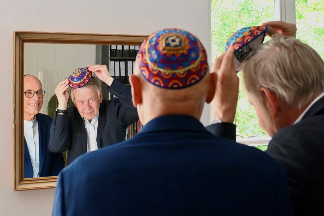 MÜNCHEN, 02. August 2024 – Mitte dieser Woche überreichte Terry Swartzberg, Vorstandsvorsitzender des Vereins „J.E.W.S. Jews Engaged with Society e.V.“, dem Direktor der Stiftung Bayerische Gedenkstätten, Karl Freller MdL, die neue „München Kippa“. Mit dieser persönlichen Geste dankte der Verein Karl Freller für seine großen Verdienste um das Gedenken.