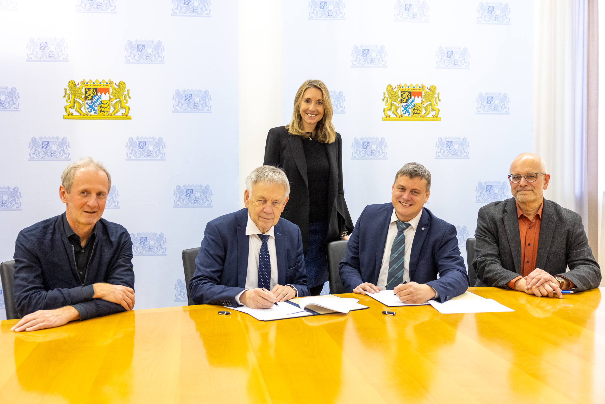 Ein bedeutender Schritt für die Erinnerungsarbeit ist gemacht: Direktor Karl Freller (Stiftung Bayerische Gedenkstätten), Prof. Dr. Jörg Skriebeleit (Leiter der KZ-Gedenkstätte Flossenbürg) sowie für die Bayerischen Staatsforsten Rainer Droste (Leiter des Bereichs Immobilien, Weitere Geschäfte) und Martin Hartinger (Leiter des Teilbereichs Grundverkehr und Forstrechte) haben im Beisein der Stiftungsratsvorsitzenden, Kultusministerin Anna Stolz, den Pachtvertrag für den historisch relevanten Teilbereich des ehemaligen KZ-Steinbruchs Wurmstein in Flossenbürg unterzeichnet. Im Rahmen der Neukonzeption der KZ-Gedenkstätte Flossenbürg wird zukünftig der Steinbruch als authentischer Ort einen zentralen Beitrag zur Aufklärung über die nationalsozialistischen Verbrechen und im Gedenken an die Leiden der Opfer leisten können.