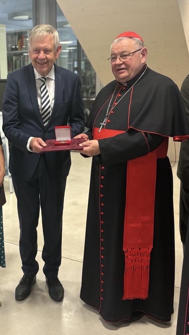 Der tschechische Kardinal Duka besucht die KZ-Gedenkstätte Dachau. „Diese Medaille aus den Händen des Kardinals zu erhalten ist für mich persönlich eine große Ehre und eine besondere Würdigung der Arbeit der Stiftung Bayerische Gedenkstätten“, so Karl Freller bei der Übergabe.