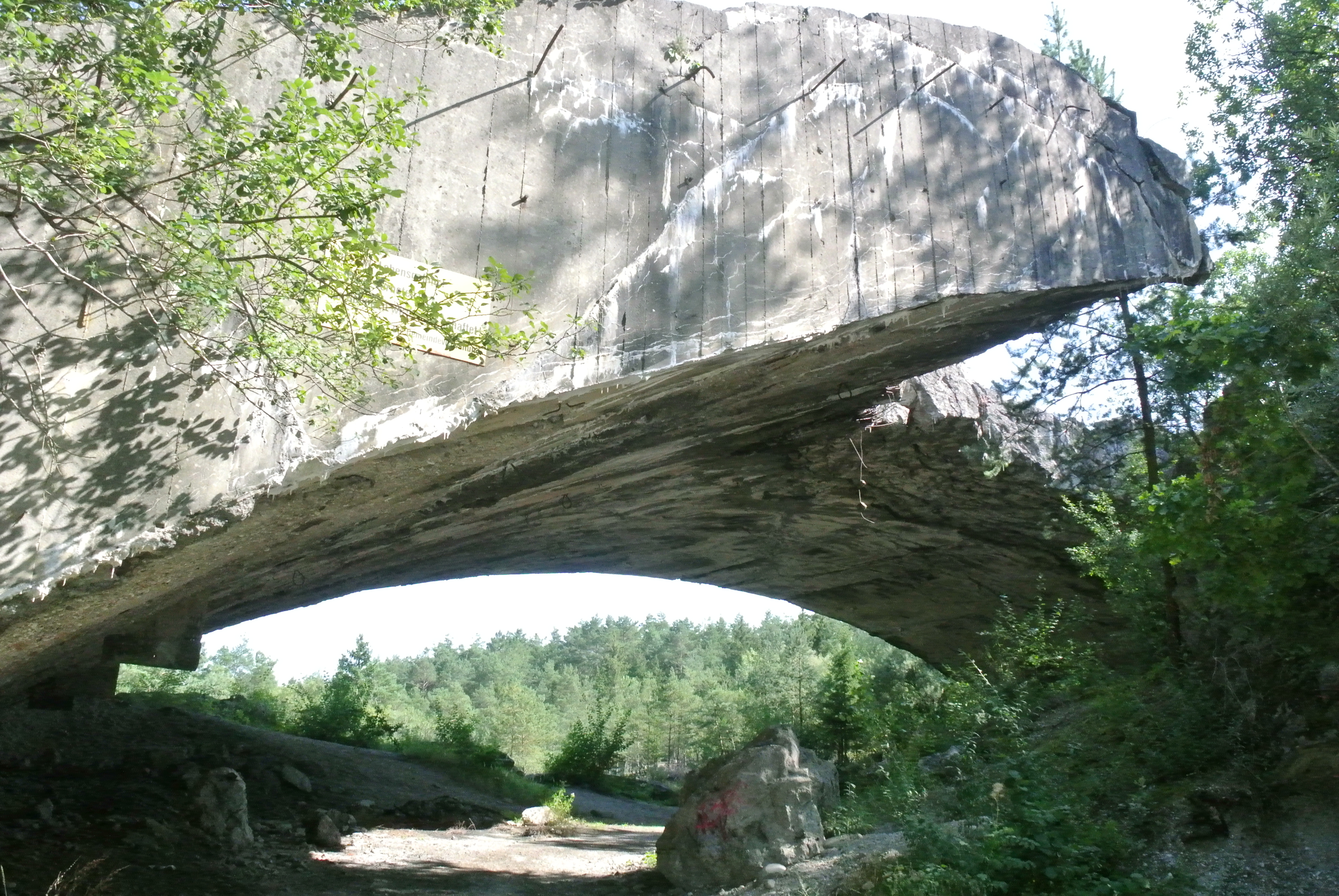 1947 wird der Bau von den Alliierten gesprengt. Ein Bogen der halbunterirdischen Fertigungshalle steht dort bis heute.