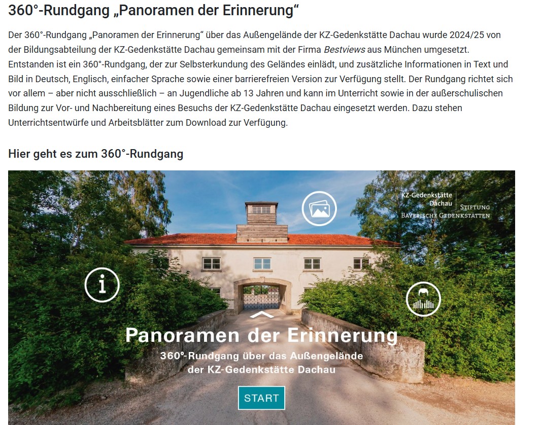 Der digitale 360°-Rundgang „Panoramen der Erinnerung“ ist auf www.kz-gedenkstaette-dachau.de in der Rubrik „Historischer Ort“ verfügbar. Der Rundgang besteht aus 360°-Fotografien und ermöglicht es Interessierten, sich intuitiv und interaktiv im digitalen Raum zu bewegen.