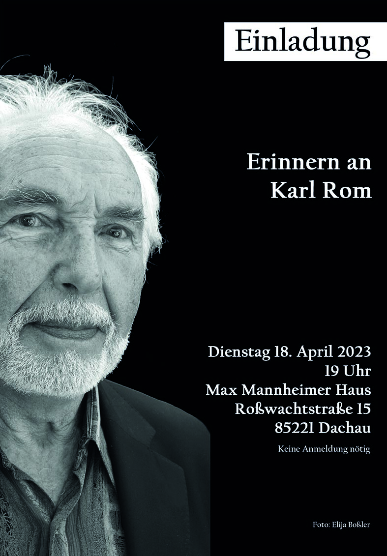 Sein Enkelsohn Daniel Silber zeigt Filmaufnahmen; über eine längere Zeit hatte er seinen Opa mit der Kamera begleitet. Mitglieder der Familie Rom-Silber berichten aber auch ganz persönlich an dem Abend von ihren Erinnerungen an den Verstorbenen, wie auch im Anschluss Menschen aus der Erinnerungs- und Gedenkstättenarbeit in Dachau, die Karl Izchak Rom begegnet waren.