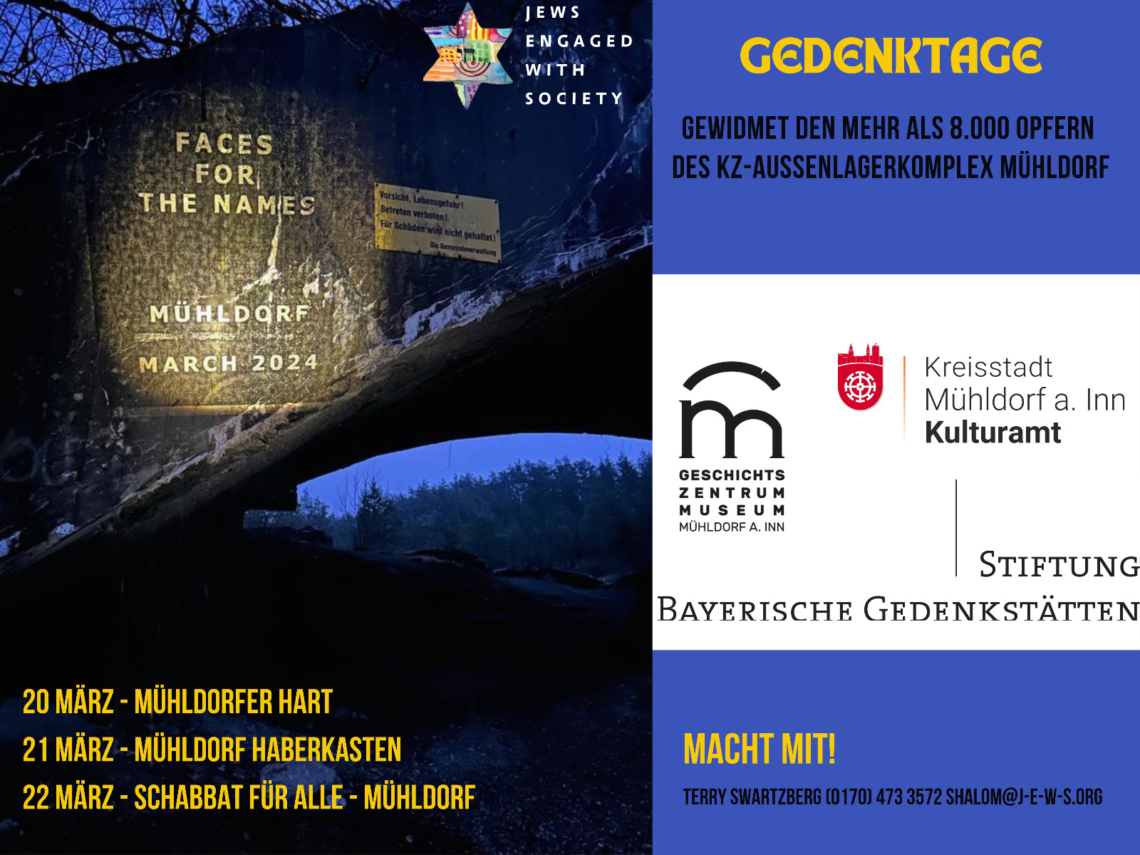 Die Gedenktage finden in Kooperation mit der Stiftung Bayerische Gedenkstätten, dem Verein Für das Erinnern KZ-Gedenkstätten Mühldorfer Hart e.V., dem Geschichtszentrum Museum Mühldorf, dem Stadtarchiv Mühldorf und dem Ruperti-Gymnasium Mühldorf statt.
