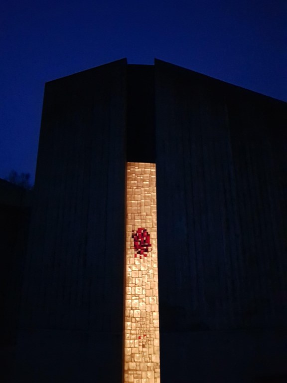 Im Fürbittengebet denkt Khystyna Maksymliuk (21), Freiwillige von Aktion Sühnezeichen Friedensdienste (ASF) an der Versöhnungskirche, an den ukrainischen KZ-Dachau-Überlebenden Vasyl Volodko (101) und an alle Menschen in ihrer Heimat. Seit vier Jahren leidet die Ukraine unter dem vom russischen Diktator Putin befohlenen mörderischen Angriffskrieg. Schon die Weiße Rose hatte im fünften Flugblatt den "Schutz des einzelnen Bürgers vor der Willkür verbrecherischer Gewaltstaaten" und ein Ende des "imperialistischen Machtgedankens" gefordert.