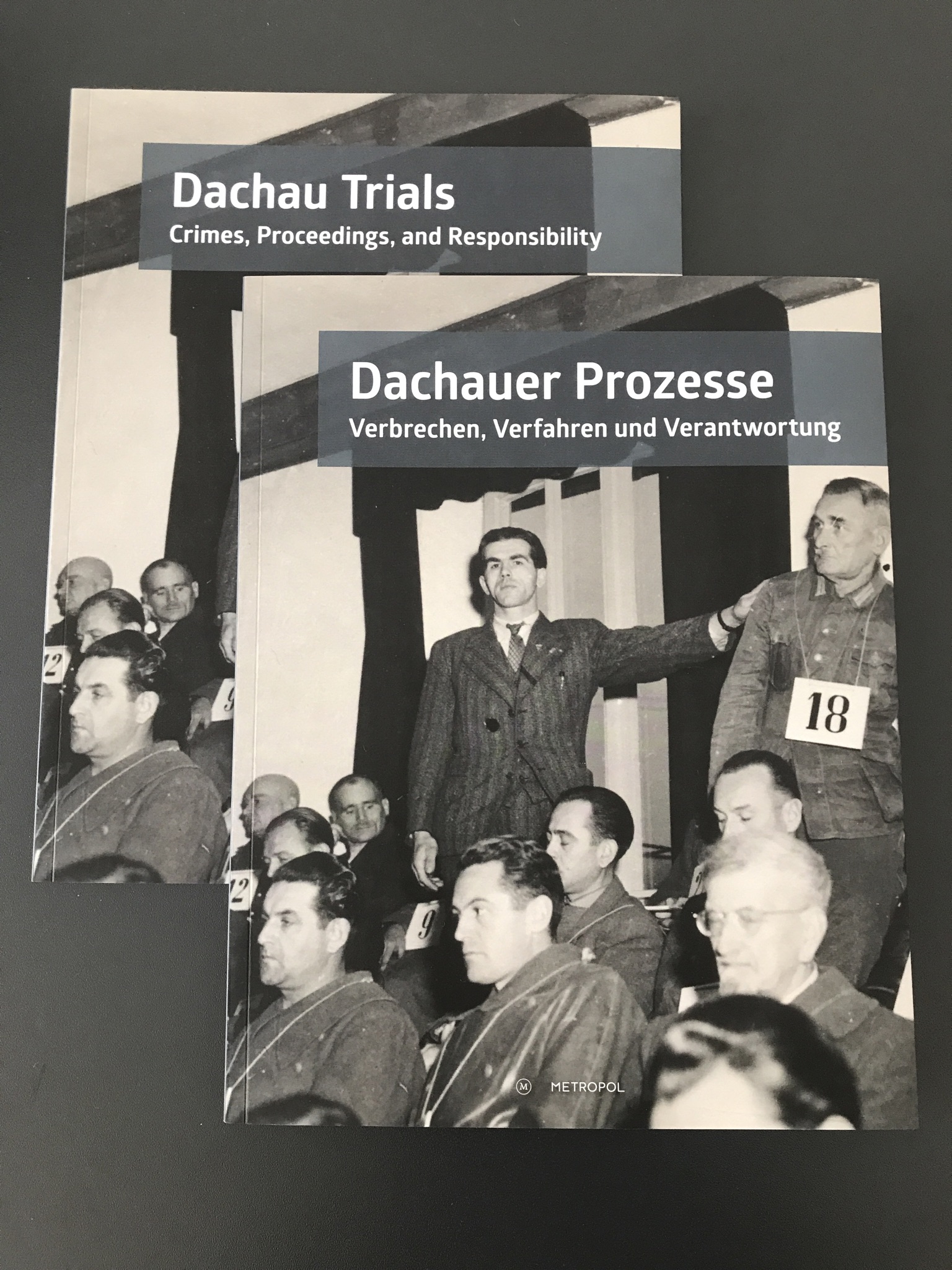 Der im Metropol-Verlag jeweils in einer deutschen und einer englischen Version erschienene begleitende Katalog zur Sonderausstellung „Dachauer Prozesse – Verbrechen, Verfahren und Verantwortung“ präsentiert die gesamten Ausstellungsinhalte als aufbereitete Fließtexte mit Quellen- und Literaturverweisen und bietet darüber hinaus Einblicke in die Konzeption und Gestaltung der Ausstellung sowie vertiefende Informationen zu den freistehenden Exponaten. Ferner werden in zwei ergänzenden Aufsätzen systematische Ausblicke auf die weitere Ahndung der in Dachau begangenen Verbrechen in Westdeutschland sowie die Wirkung der Dachauer Prozesse im internationalen Strafrecht gegeben.