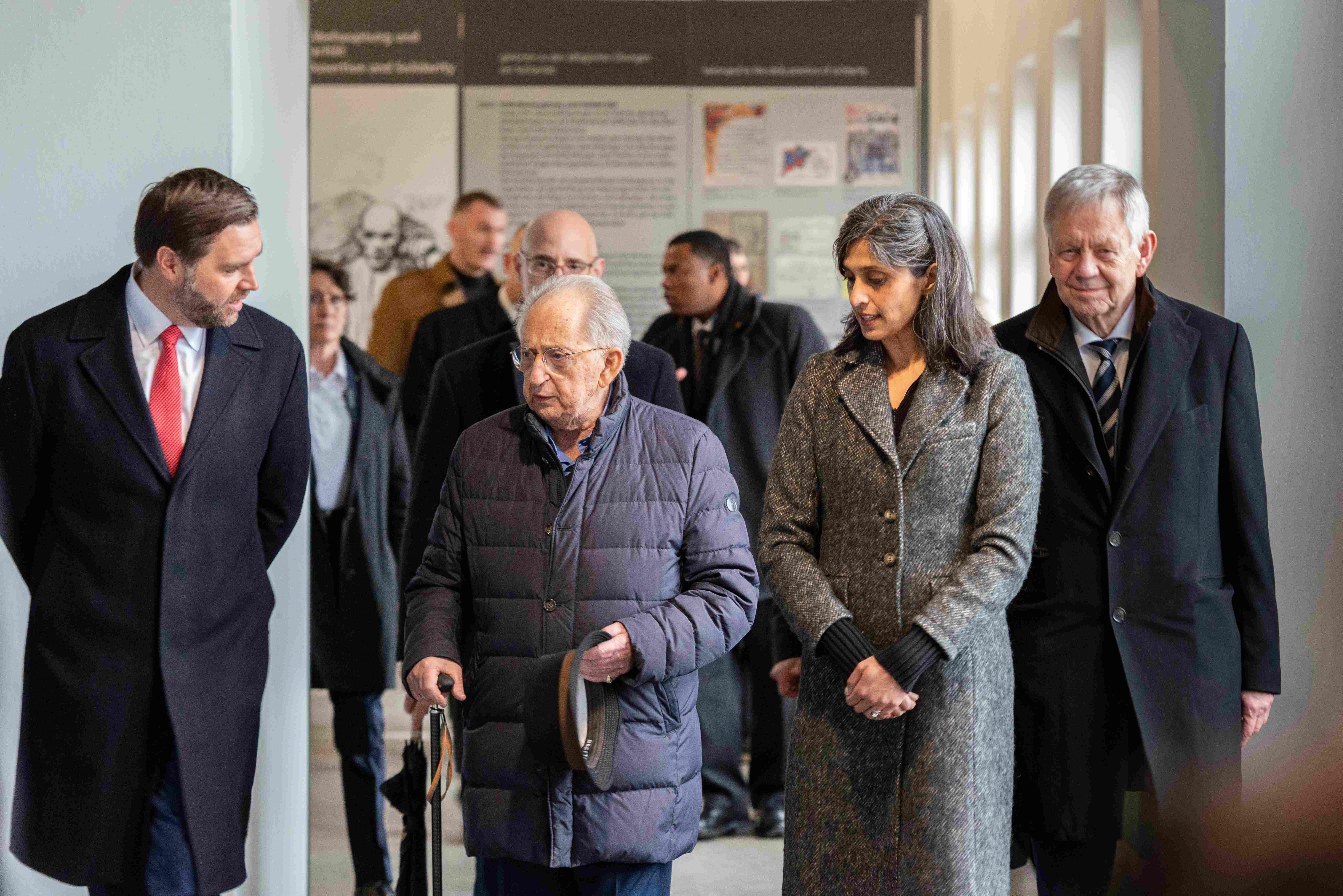 Nach einer Begrüßung durch den ehrenamtlichen Direktor der Stiftung Bayerische Gedenkstätten, Karl Freller, und der Gedenkstättenleiterin, Dr. Gabriele Hammermann, konnten sich die Besucher mit dem Zeitzeugen und Holocaust-Überlebenden Abba Naor (96) austauschen, der in einem Außenlager des KZ Dachau als Jugendlicher einst härteste Zwangsarbeit verrichten musste. Naor erklärte dem Vizepräsidenten und seiner Gattin anhand einer Karte die Stationen seines Leidensweges und zeigte ihnen seine Registrierkarte. VP JD Vance wird zitiert wie er sagte: „Ich habe viel über den Holocaust in Büchern gelesen. Aber hier zu sein, und es aus nächster Nähe zu sehen, macht deutlich, welch unaussprechliches Übel an diesem Ort begangen wurde und warum wir uns dafür einsetzen sollten, dass so etwas nie wieder geschieht.“